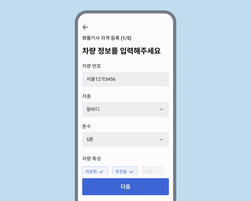 스크롤을 내려서 적재함 길이까지 모두 작성해야 다음 단계로 넘어갈 수 있어요.