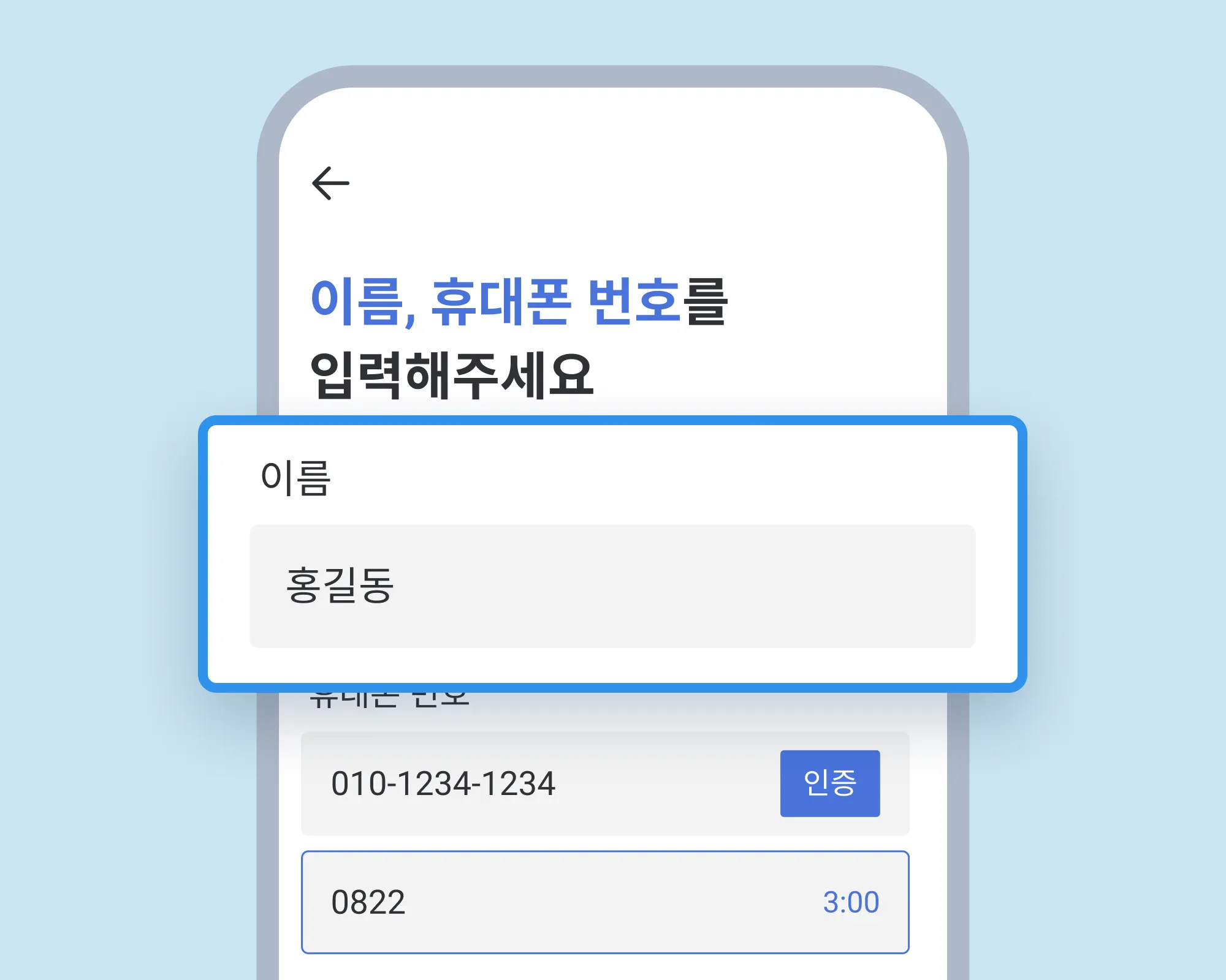휴대폰 번호 인증 시 본명을 띄어쓰기 없이 정확하게 입력해 주셔야 심사가 가능해요.