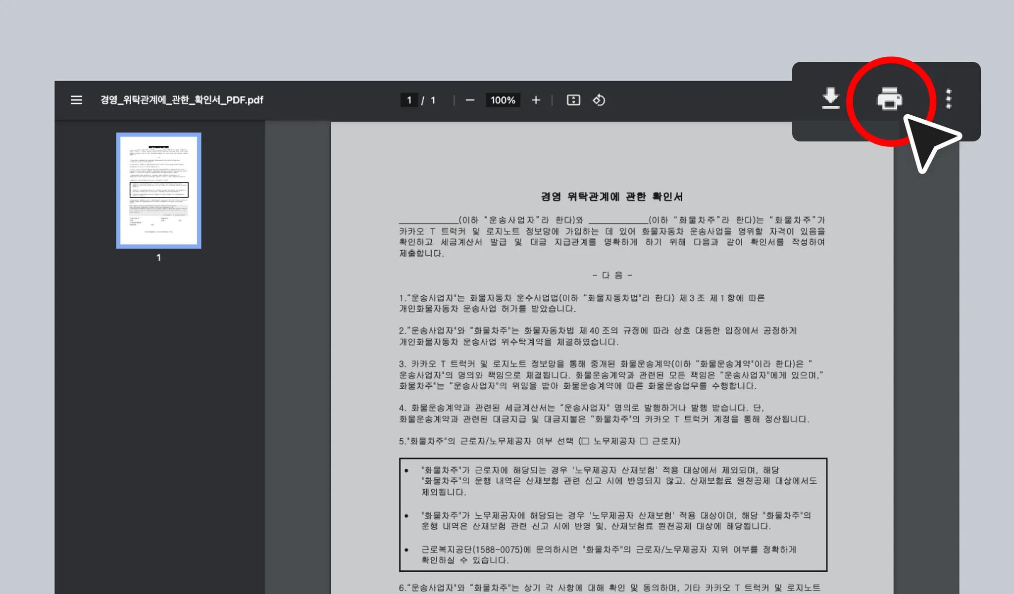 사업자등록증 대표자께서 카카오 T 트럭커 고객센터 1644-8830 (트럭커 바로 연결: 숫자 4번을 눌러주세요)로 전화하셔서 경영 위탁관계 확인서 제출에 구두로 동의해 주세요.